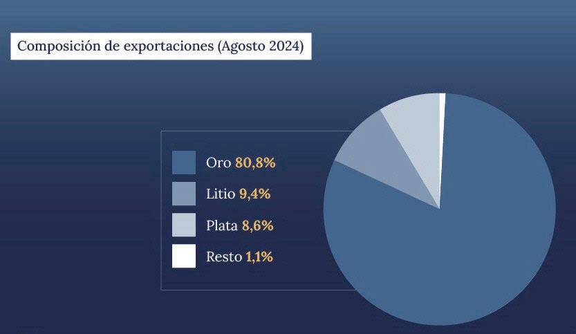 La Secretaría de Minería de la Nación informó que “en agosto último se registraron exportacio‑ nes por un total de USD 533 mi‑ llones, provenientes de 16 pro‑ yectos en cartera. El oro, el litio y la plata representaron el 98,9% de las comercializaciones del mes”.