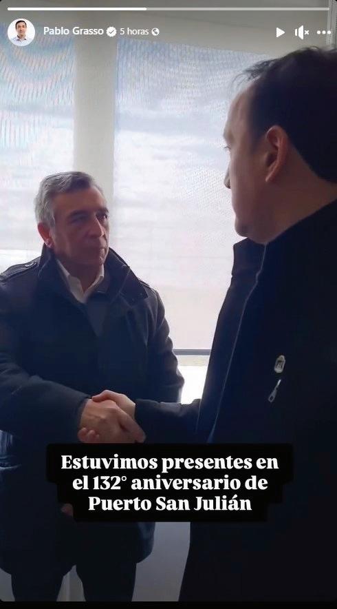 Este martes, el intendente de Río Gallegos Pablo Grasso viajó junto a parte de su equipo de go‑ bierno a la localidad de Puerto San Julián para participar de la celebración en el mástil mayor por el 123° aniversario. Lo hizo invitado por el jefe comunal de la localidad, Daniel Gardonio, uno de los principales artífices de la alianza entre un sector de la UCR con el partido SER Santa Cruz que llevó a Claudio Vidal a la go‑ bernación.