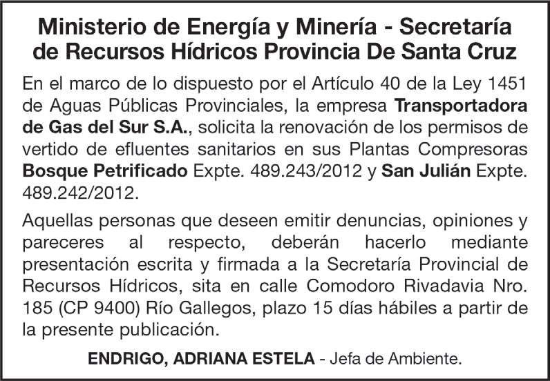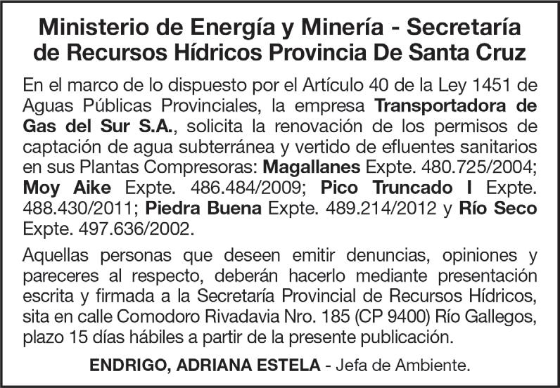 La empresa Transportes Unidos Sociedad Anónima CUIT 30656866361, comunica que en el marco de lo dispuesto por el Artículo 40 de la Ley 1.451 de Aguas Públicas Provinciales, solicitó el permiso de captación de agua pública en el proyecto denominado Captación para uso Industrial, ubicado en Manzana 288 B° Industrial, de la localidad de Las Heras, Provincia de Santa Cruz. Aquellas personas que deseen emitir denuncias, opiniones y pareceres al respecto, deberán hacerlo mediante presentación escrita y firmada a la Secretaría de Estado de Recursos Hídricos, sita en calle Comodoro Rivadavia Nº 185 (CP 9400) Río Gallegos, en un plazo de 15 días hábiles a partir de la presente publicación.
