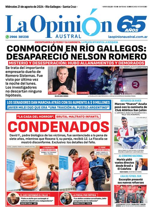 LA OPINION AUSTRAL fundada por Alberto Raúl Segovia el 27 de febrero de 1959. RNP N° en trámite. Propietario: LA OPINION AUSTRAL S.A. Dirección, Redacción y Administración: Zapiola 35. Planta Impresora y Distribución: Av. Lisandro de la Torre 991 (C.P. 9400) Río Gallegos, Fagnano 2156 (C.P. 9011) Caleta Olivia, Provincia de Santa Cruz, República Argentina. Teléfonos: (02966) 420185 / 420029, (0297) 154160785. Fax aut. las 24 hs. 422608. Publicidad 420023. Representante Comercial en Buenos Aires: Montiel S.A. Esmeralda 339 pisos 9 y 10 Tel. 43256078/6070/6079. Diario de la mañana. Miembro Fundador de la Asociación de Entidades Periodísticas de la Argentina (ADEPA), Asociación de Diarios del Interior (ADIRA).