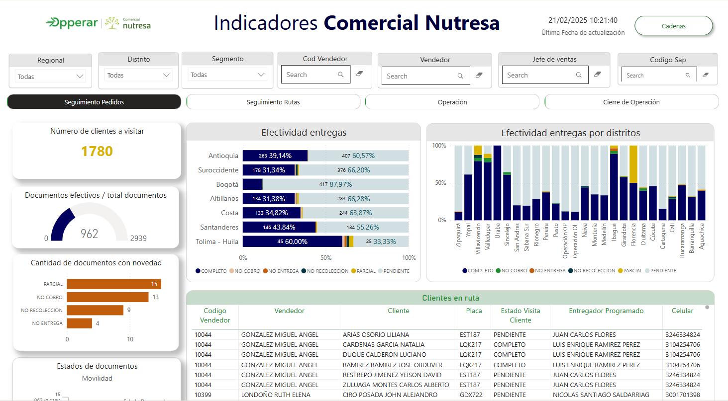 Ahora contamos con una actualización automática de nuestros indicadores que proporciona una visión completa y con una mayor frecuencia del proceso de distribución urbana. Desde la gestión de pedidos hasta la efectividad de las rutas, este tablero optimizado permite una mejor toma de decisiones al integrar de manera eficiente la