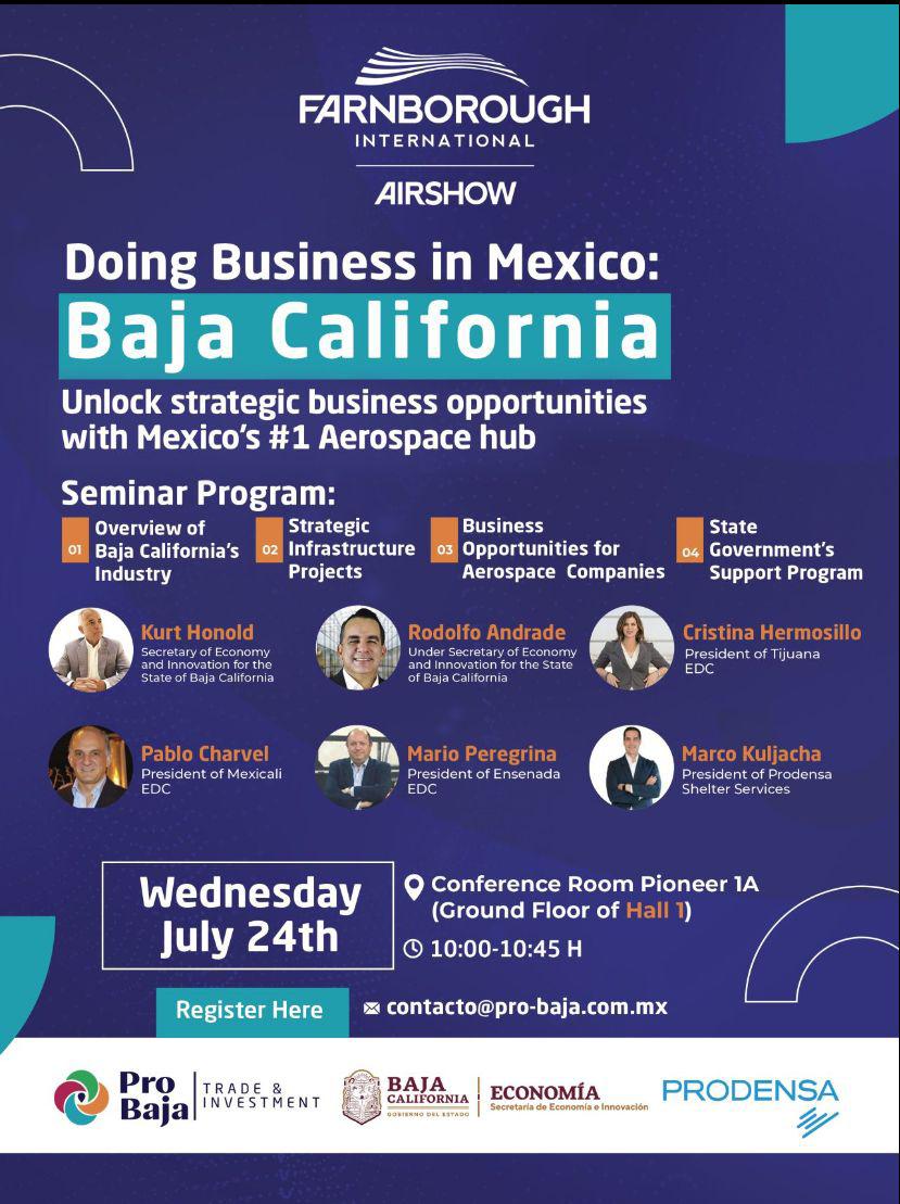 Pro Baja, the State Government and Prodensa are preparing for the Farnborough International Airshow. They will be giving the seminar How to do Business in Mexico: looking for opportunities for the aerospace industry, highlighting Baja California as an Aerospace hub. They will talk about Baja California’s industry overview, strategic infrastructure projects, business opportunities, business opportunities for aerospace companies and state government support programs.