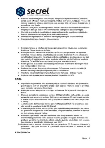 Foi implementada a Interface do Nexgen para dispositivos móveis, que contempla o Pedido de Cliente de Venda de Ótica. Foi implementada na Interface do Pedido de Ótica do Nexgen Mobile as seguintes melhorias: Criação de tela simplificada para cadastro de clientes: A nova tela deverá ser utilizada em dispositivo móvel que será disponibilizado ao cliente para que ele faça seu cadastro. Paralelamente a isso o vendedor utilizará a tela de Pedido de venda de Cliente de Ótica (PEDCV) em seu tablet para gerar o pedido de venda. Foram geradas as classes e atualizadas para correção do ambiente do nexgen móvel que havia parado de funcionar. Implementar o envio de preço e estoque para o E-Commerce, quando o produto já existir e for configurado para disponível para o E-commerce. O sistema não emitia Notas Simples Faturamento Remessa – Entrega Futura. Implementada a gravação da observação vinda de pedidos do SFA.
