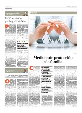 ción familiar y profesional, pero en los otros tipos de empresa las medidas son prácticamente inexistentes y, en especial en las pequeñas y medianas empresas en las que, con un reducido número de personal, se hace muy difícil la implementación de cualquier medida. Nuestro tejido empresarial está especialmente constituido por pequeñas y medianas empresas, por lo tanto se necesita un tipo de intervenciones que sean viables en estas últimas. La previsión de servicios es otro de los apartados a considerar en las medidas de protección a la familia: jardines de infancia con horarios flexibles y amplios, sin que eso signifique que los niños tengan que estar ahí desde las ocho de la mañana hasta las ocho de la tarde; simplemente que se adapten a los horarios laborales de los padres; y lo mismo se puede decir de las escuelas de Primaria, porque la protección a la familia va más allá de la primera infancia del niño. Cuando se habla de protección a la familia se corre el riesgo de considerar solamente las primeras etapas de la vida, pero hay que pensar también en las personas mayores o enfermas, que también forman parte de la familia, pero eso será tema para otra ocasión. Sofía Gallego Psicóloga y pedagoga ® Àmbit Maria Corral