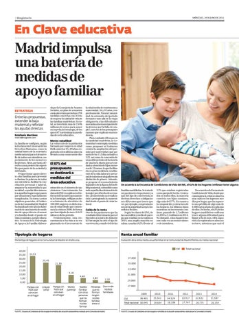 la edad media de matrimonio y maternidad, 36 y 32 años, respectivamente. Para la Comunidad, la extensión del periodo formativo más allá de la etapa obligatoria y las dificultades asociadas a la emancipación de los jóvenes por la falta de empleo, son dos de las principales razones que explican esta tendencia. Para combatir el frenazo en la natalidad madrileña, la Comunidad contempla medidas como proponer al Gobierno central la ampliación del permiso por maternidad, que pasaría de los 112 días actuales a 122, así como la concesión de un posible permiso de lactancia de una hora diaria para el cuidado y atención de hijos menores de 12 meses, lo que facilitaría en gran medida la conciliación de la vida laboral y personal de todos los trabajadores sin distinción de género. Además, se propone el reconocimiento legislativo de la figura del mobbingmaternal, entendido como toda aquella discriminación de la mujer por el hecho de ser madre, promoviendo su erradicación y protegiendo la maternidad desde el punto de vista laboral. Caída de la renta Otro de los parámetros que ha resultado determinante para el Ejecutivo a la hora de elaborar la Estrategia ha sido el tipo de convivencia y estado civil de las