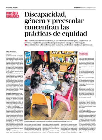 Discapacidad, género y preescolar concentran las prácticas de equidad b La población afrodescendiente, el colectivo menos reflejado, seguido de las personas migrantes, pacientes hospitalizados o en reposo prolongado. b El alcance más alto en Educación inclusiva se observa en el nivel preescolar.