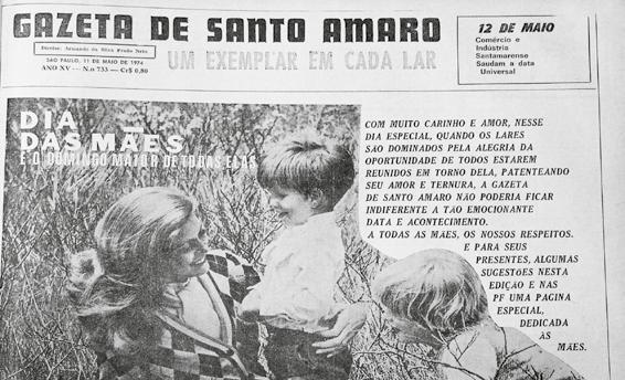 Em 11 de maio de 1974 a Gazeta de Santo Amaro publicou como matéria de capa: “DIA DAS MÃES É O DOMINGO MAIOR DE TODAS ELAS”. Com muito carinho e amor, nesse dia especial, quando os lares são