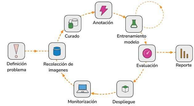 Pese a los exponenciales avances tecnológicos experimentados en el campo de la visión por computador, es imprescindible no dejar de lado una estrategia basada en los datos que permita la adaptación de los modelos a las condiciones cambiantes de los entornos reales. Por ello, resulta fundamental implementar aprendizaje continuo, situando a los expertos en el centro de la estrategia de gestión del ciclo de vida de los modelos de Deep Learning, lo que permite prolongar su vida útil al mantener la confianza en sus predicciones.