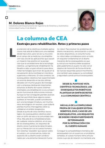 MÁS ALLÁ DE LA COMPLEJIDAD PROPIA DE CUALQUIER SISTEMA ROBÓTICO, EN EL CASO DE LOS EXOESQUELETOS, LOS REQUISITOS DE DISEÑO VIENEN FUERTEMENTE DETERMINADOS POR SU INTERACCIÓN CON EL CUERPO HUMANO Conseguir la compatibilidad cinemática del exoesqueleto con el usuario es un problema complejo, el cuerpo humano tiene articulaciones cuyo eje de rotación no mantiene una DICIEMBRE 2025 / N.º 566