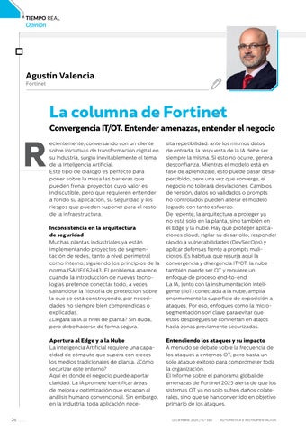 ecientemente, conversando con un cliente sobre iniciativas de transformación digital en su industria, surgió inevitablemente el tema de la Inteligencia Artificial. Este tipo de diálogo es perfecto para poner sobre la mesa las barreras que pueden frenar proyectos cuyo valor es indiscutible, pero que requieren entender a fondo su aplicación, su seguridad y los riesgos que pueden suponer para el resto de la infraestructura. Inconsistencia en la arquitectura de seguridad Muchas plantas industriales ya están implementando proyectos de segmentación de redes, tanto a nivel perimetral como interno, siguiendo los principios de la norma ISA/IEC62443. El problema aparece cuando la introducción de nuevas tecnologías pretende conectar todo, a veces saltándose la filosofía de protección sobre la que se está construyendo, por necesidades no siempre bien comprendidas o explicadas. ¿Llegará la IA al nivel de planta? Sin duda, pero debe hacerse de forma segura.