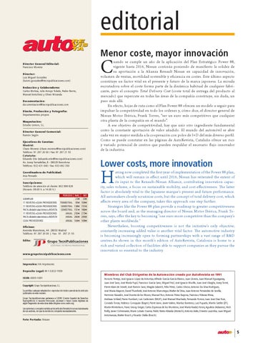 uando se cumple un año de la aplicación del Plan Estratégico Power 88, vigente hasta 2016, Nissan continúa poniendo de manifiesto la solidez de su aportación a la Alianza Renault Nissan en capacidad de innovación, volumen de ventas, movilidad sostenible y eficiencia en costes. Este último aspecto constituye un factor vital en el presente y futuro de la marca japonesa. La mirada escrutadora sobre el coste forma parte de la dinámica habitual de cualquier fabricante, pero el concepto Total Delivery Cost (coste total de entrega del producto al mercado) que repercute en todas las áreas de la compañía constituye, sin duda, un paso más allá. En efecto, hojas de ruta como el Plan Power 88 ofrecen un modelo a seguir para impulsar la competitividad en todo los ordenes y, cómo dice, el director general de Nissan Motor Ibérica, Frank Torres, “ser un euro más competitivos que cualquier otra planta de la compañía en el mundo”. A ese objetivo de competitividad, hay que unir otro ingrediente fundamental como la constante aportación de valor añadido. El mundo del automóvil se abre cada vez en mayor medida a la cooperación con polos de I+D del más diverso perfil. Como se puede constatar en las páginas de AutoRevista, Cataluña ofrece un rico y variado potencial de centros que pueden respaldar el necesario flujo innovador de la industria.