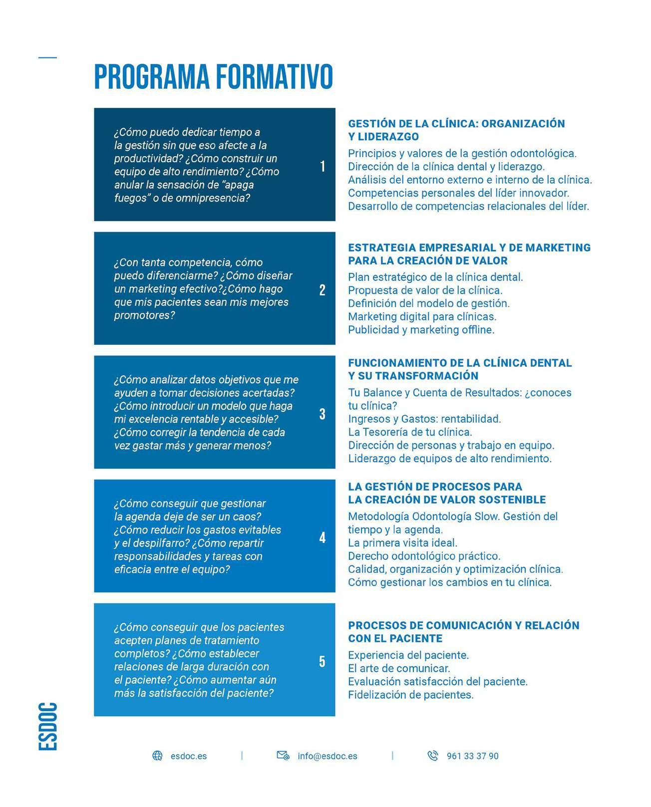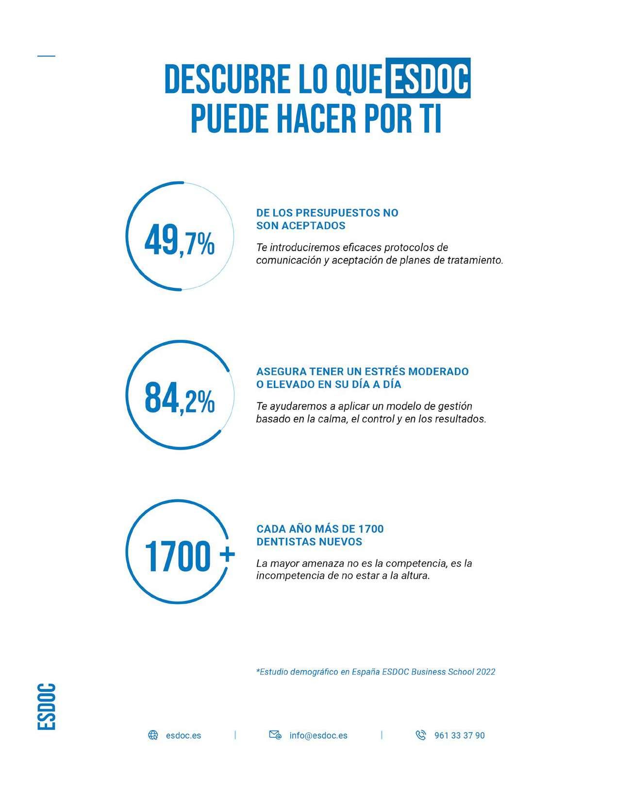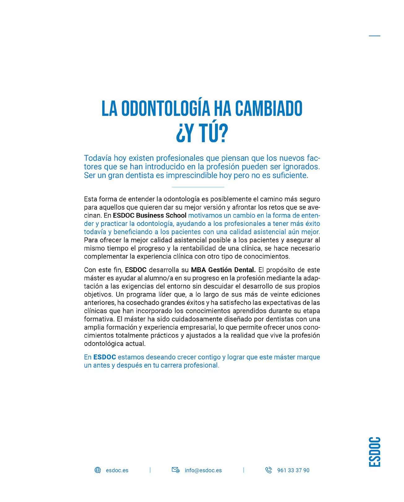 ESCUELA EMPRESARIAL PARA DOCTORES Y PROFESIONALES DE LA SALUD Alcanza el equilibrio entre la práctica clínica y la gestión www.esdoc.es 961 333 790 info@esdoc.es