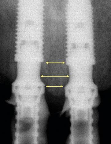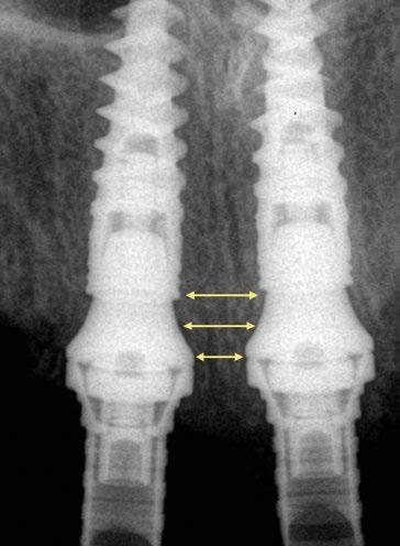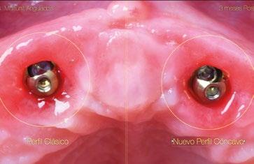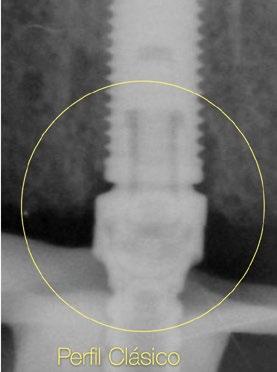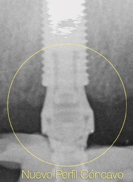 radiografías periapicales comparativas a los 3 meses de la colocación como el implante en posición #1.2 tiene signos de remodelación fisiológica. Hecho que no ocurre en los pilares con nuevos perfiles al ofrecer transiciones más suaves que respetan los principios biológicos.