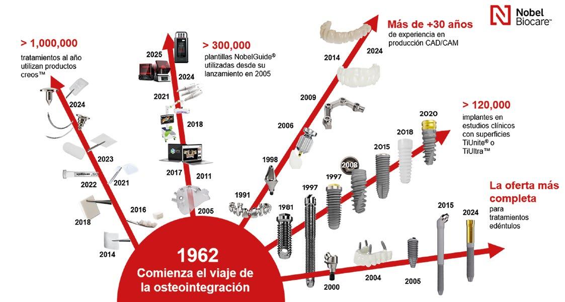V.A.- Desde el descubrimiento de la osteointegración por el profesor Brånemark hasta el desarrollo del sistema N1™, Nobel Biocare ha transformado la implantología. La introducción de la cirugía guiada y navegada, el protocolo All-on-4® y la integración digital con DTX Studio™ han sido puntos de inflexión que han redefinido la práctica clínica.