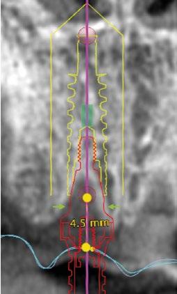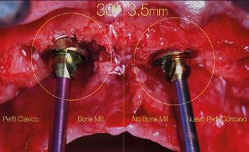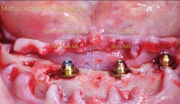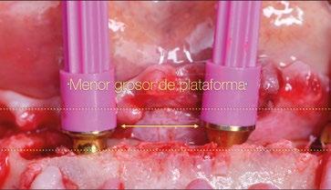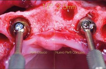 circular en el implante en posición #1.2 versus la no remodelación de un pilar de nuevo perfil de altura 3,5mm en un implante colocado 2mm subcrestal. La limitación de los pilares de 17º clásicos es que emergen muy rápidamente hacia el diámetro de 4,8mm de la plataforma restauradora y de nuevo no existe espacio suficiente para el establecimiento biológico de la altura de tejido supracrestal. Claramente se observa en las