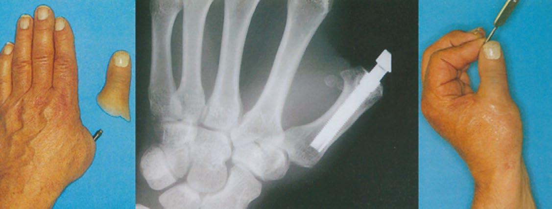 1. Hagert, Brånemark y col. en la Scandinavian Journal of Plastic and Reconstructive Surgery presentaron un caso de artroplastia de la articulación metacarpofalángica del pulgar izquierdo utilizando un implante osteointegrado. Gracias a ello, el paciente recuperó la función de pinza con la mano. (Figura 2)