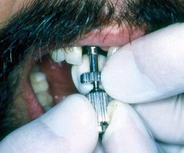 Ya estabilizados los tejidos, se procedió a la toma de impresiones y a la rehabilitación de ambos incisivos mediante coronas metalcerámicas. Para ello se utilizó el pilar para unitarios diseñado por Torsten Jemt, que, junto con un dispositivo también desarrollado ad hoc, permitía atornillar el pilar ejerciendo un cierto contratorque que hoy en día sabemos innecesario en un implante integrado. (Figura 7)