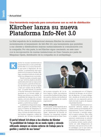 de la propia compañía, de “un entorno seguro y fiable, que estamos convencidos facilitará la labor diaria de nuestros clientes y les facilitará el acceso a la información de nuestra organización”. Nueva delegación Por otra parte, la filial española de la multinacional alemana ha informado recientemente de que Máquinas Opein, distribuidor de Kärcher en Canarias, ha inaugurado recientemente instalaciones en Gran Cana-