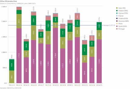Para la campaña 2025/26, Italia se perfila como un año de carga, con una producción estimada superior a 300.000 toneladas (+20 %), lo que podría mejorar su nivel de autosuficiencia. Los principales riesgos se concentran en el norte, donde la mosca del olivo podría reducir los rendimientos hasta un 40 %, mientras que Puglia y Calabria —que representan alrededor del 60 % de la producción nacional— registran perspectivas favorables. En el resto del Mediterráneo, la producción se mantendrá estable en Grecia (220–240 Kt) y Portugal