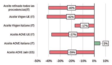 Las diferencias por calidades son significativas: el aceite virgen nacional cayó un 17 % desde octubre de 2024, mientras que el refinado (de cualquier origen) descendió un 40 %.