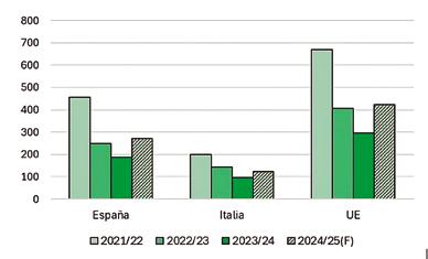 Producción y oferta europea en recuperación. La campaña 2024/2025 marcó un punto de inflexión tras dos años de fuertes caídas productivas. La producción europea aumentó un 36 % respecto a 2023/24, impulsada principalmente por España, que alcanzó 1,4 millones de toneladas, un incremento del 65 % interanual y un 9 % por encima de la media quinquenal. Esta recuperación fue acompañada por fuertes importaciones desde Túnez y Turquía, países que registraron cosechas abundantes y se beneficiaron de su competitividad en precio. En consecuencia, el aumento de la oferta permitió reactivar el consumo interno español (+24 %) y potenciar las exportaciones (+36 %) hasta agosto de 2025. A nivel europeo, las existencias finales se incrementaron un 43 % respecto a septiembre de 2024, y en España el aumento fue del 46 %, revirtiendo la tendencia de agotamiento observada en las dos campañas anteriores. No obstante, las reservas siguen siendo inferiores a los niveles históricos, lo que mantiene un cierto desequilibrio estructural.