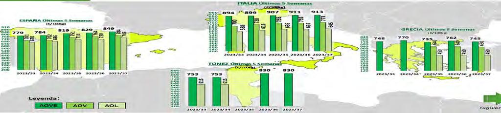 PRECIOS €/t PRECIOS €/t TENDENCIA GRECIA 28/09/23 05/10/23 Virgen Extra 8250 8250 Refinable, base 1º 5850 5850 Refinado s/c s/c s/c ITALIA 26/09/23 03/10/23 Virgen Extra 9200/9400 9200/9400 Refinado 7400/7500 7300/7400 TÚNEZ 28/09/23 05/10/23 Virgen Extra 8300 8300 Refinable, base 2º 6150 6150 Refinado s/c s/c s/c TURQUÍA 28/09/23 05/10/23 Refinado s/c s/c s/c PORTUGAL 28/09/23 05/10/23 Virgen Extra 7700/8200 7700/8200 Virgen s/c s/c s/c Refinable, base 1º 7000 7000 MARRUECOS 28/09/23 05/10/23 Virgen Extra 7500/8200 7500/8000 Virgen s/c s/c s/c Refinado s/c s/c s/c