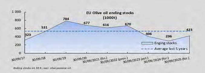 Los stocks finales en los mercados productores de aceite de oliva en Europa nos muestran un descenso con respecto a las cinco últimas campañas, y una recuperación, con respecto a las dos últimas. Datos a 30 de septiembre. Fuente: European Commission/Agridata/Olive oil and table olives Market.