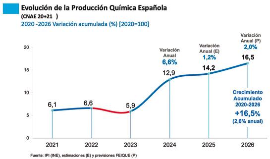 Con estas estimaciones, la industria química habrá sumado entre 2020 y 2026 un crecimiento del 37,8% en su facturación, con un ritmo medio anual del 5,5%, manteniéndose como el segundo mayor sector industrial del país.