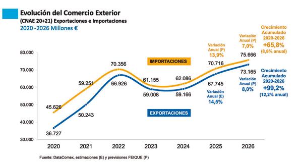 Para 2026, Feique prevé un nuevo incremento del 8% en las exportaciones, lo que llevará al sector a duplicar su comercio exterior respecto a 2020 (99,2% acumulado). Las importaciones aumentarán un 7%.