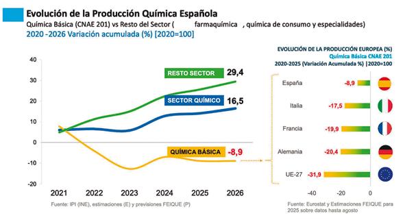 en producción, un resultado notable si se considera el impacto que han tenido en estos años la pandemia, la guerra en Ucrania o las tensiones en las cadenas de suministro. La media anual del 2,6% confirma la resiliencia de una industria que sigue consolidándose como motor económico. En cuanto a la cifra de negocios, Feique prevé un crecimiento del 1% en 2025, hasta los 86.023 millones de euros, una evolución condicionada por la caída de precios y la debilidad de la demanda europea. Para 2026, las previsiones apuntan a un avance del 3% hasta alcanzar los 88.928 millones de euros a medida que se recupere el mercado.