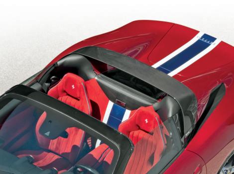 O interior surge forrado a Alcantara vermelha, como o exterior, combinada com o branco, o azul e o negro dos muitos elementos de carbono. Um trabalho primoroso sobre o Gran Turismo por excelência de Maranello, como todos os que já vimos do departamento mais exclusivo da marca do cavallino rampante.