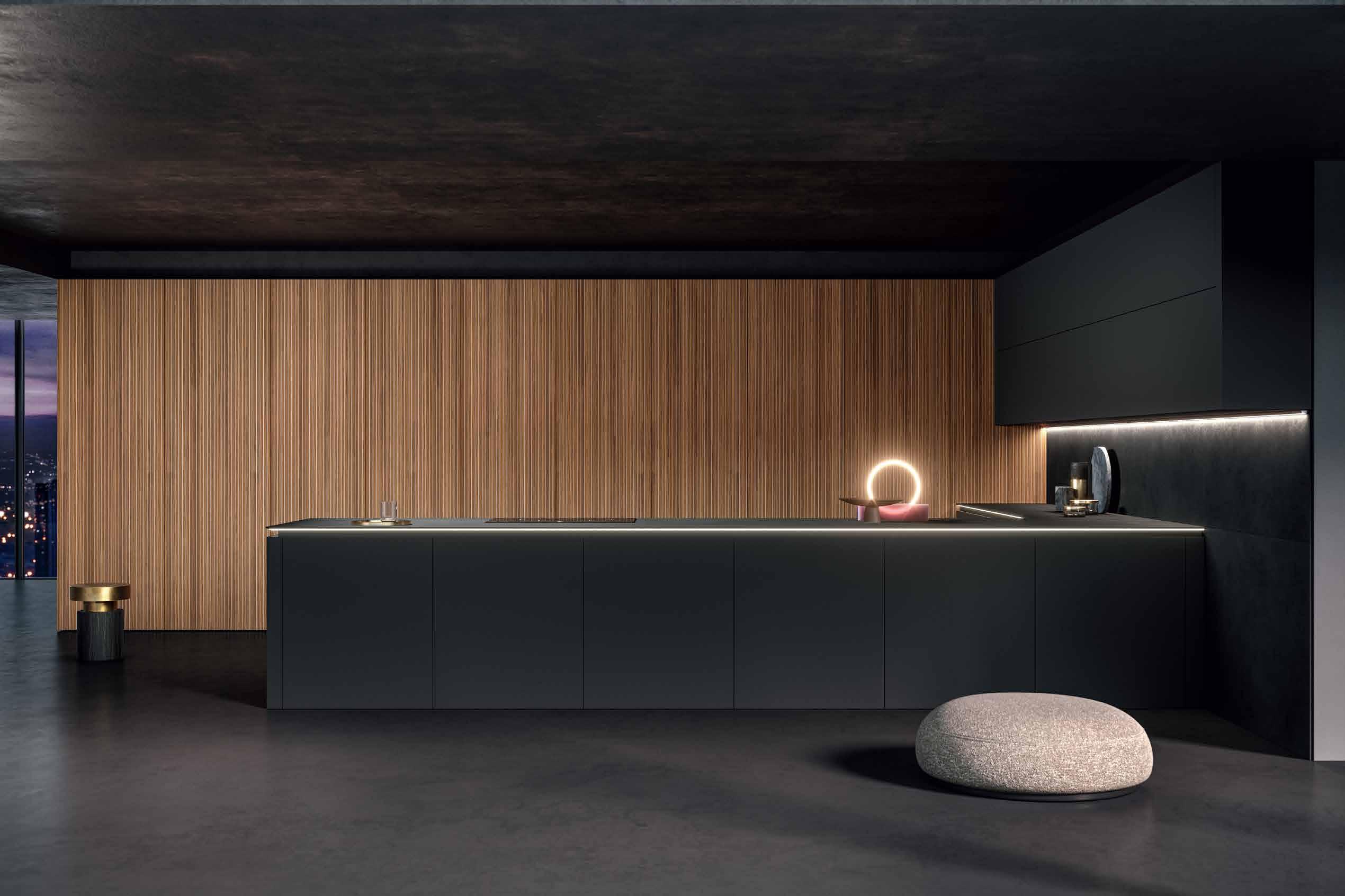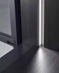 Η κουζίνα γίνεται ο αποκλειστικός χώρος διαβίωσης με το σύστημα L που διατίθεται με χειροκίνητη κάθετα ανοιγόμενη πόρτα ανύψωσης. Η ανοιχτή και λειτουργική λύση μπορεί να μετατραπεί σε μια κλειστή διάταξη που αποκαλύπτει τη μονάδα. Μια απλή ενέργεια, μετατρέπει έναν χώρο εργασίας σε έναν φιλόξενο και χαλαρωτικό χώρο. Η διάταξη μπορεί να πλαισιωθεί με ένα πλαϊνό πάνελ πάχους 12 mm για να κρύψει τη λειτουργική περιοχή.