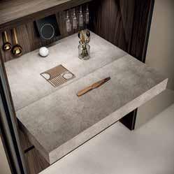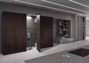 Οι pocket doors Sipario οι οποίες καταλαμβάνουν όλο το ύψος, κλείνουν και αποκρύπτουν τη λειτουργική περιοχή, συμβάλλοντας έτσι στο σχεδιασμό μινιμαλιστικών λύσεων. Το φινίρισμα των ψηλών μονάδων είναι από ξύλο Ευρωπαϊκής καρυδιάς και διαθέτει ραβδώσεις αλουμινίου, από θαμπό γυαλί με μεταλλικό πλέγμα. Εσωτερικά οι pocket doors Sipario μπορούν να δεχθούν ηλεκτρικές συσκευές, αποθηκευτικές μονάδες, εξοπλισμό προετοιμασίας φαγητού. Σε όλες τις λύσεις μπορεί να ρυθμιστεί το βάθος, το πλάτος και το ύψος. Μια μοναδική λύση αποτελεί ο πτυσσόμενος πάγκος εργασίας σε laminate γκρι arenaria.
