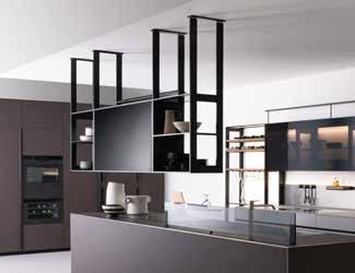 Μια τεχνολογική και ελαφριά κονσόλα γέφυρας από μαύρο ανοδιωμένο αλουμίνιο, τοποθετημένη πάνω από τη νησίδα. Διαφορετικά αξεσουάρ και εργαλεία κουζίνας για την προετοιμασία γευμάτων, καθώς και ένα διάχυτο φως, μπορούν να τοποθετηθούν άνετα σε αυτό. Αυτή η δομή καλύπτει την ανάγκη για ένα διακριτικό εξοπλισμένο στοιχείο, λειτουργικό και ελαφρύ, διαθέσιμο σε όλες τις σειρές.