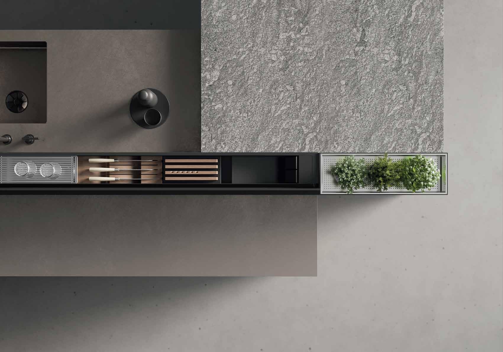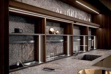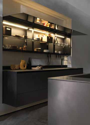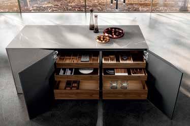στεί με μικρές πτυσσόμενες πόρτες, διαθέσιμες σε όλη τη γκάμα υλικών της Snaidero. Το σύστημα S μπορεί να ενσωματωθεί στους λειτουργικούς πάγκους εργασίας ξεκινώντας από 74 cm βάθος, ενώ, εάν ο πάγκος είναι βοηθητικός, το Το σύστημα M μπορεί να ενσωματωθεί σε τοίχο και σε νησίδας. Η λύση έχει βάθος 22cm και εξοπλίζει την κουζίνα με αποκλειστικά στοιχεία και προσφέρει πολλά περιθώρια προσαρμογής. Σε νησίδα στηρίζεται στον πάγκο εργασίας και διαθέτει ένα ειδικό πίσω πάνελ ύψους 44 cm σε σκούρο γυαλί δημιουργώ-