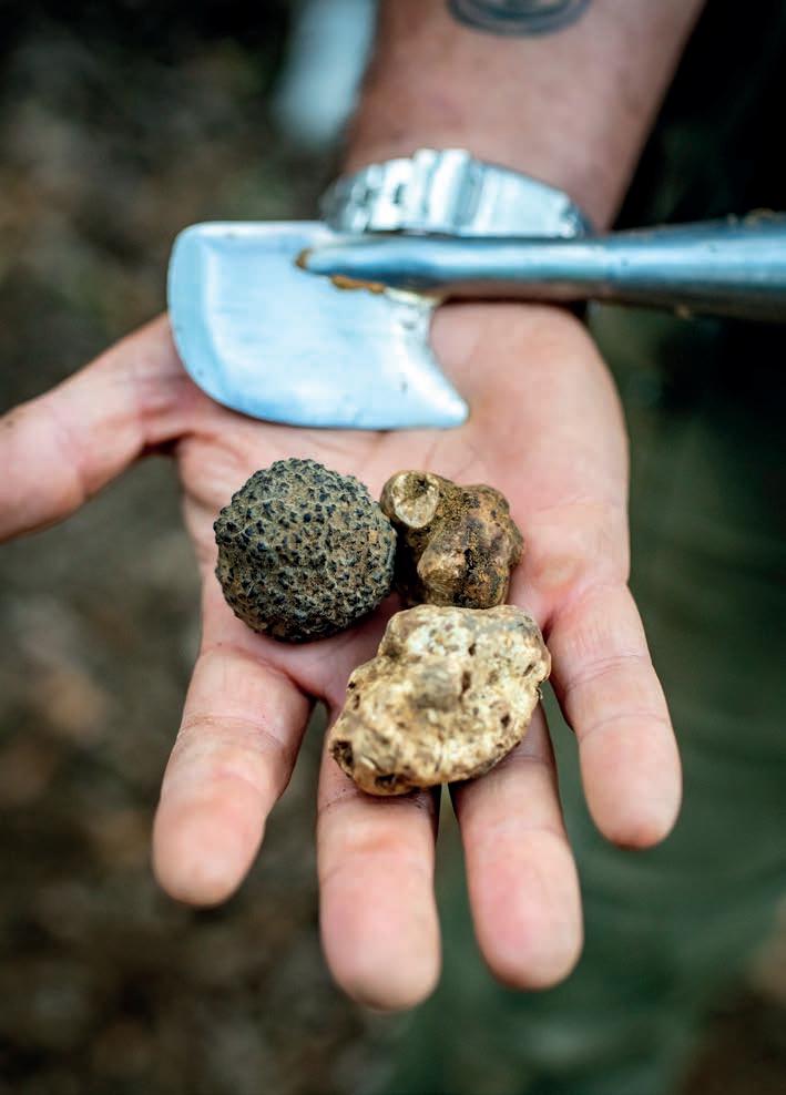 TEO SHOWS A SCORZONE TRUFFLE (TO THE LEFT) AND TWO BIANCHETTI MARZUOLO TRUFFLES. ABOVE, THE VANGHETTO, A TRADITIONAL TOOL USED TO UNEARTH TRUFFLES