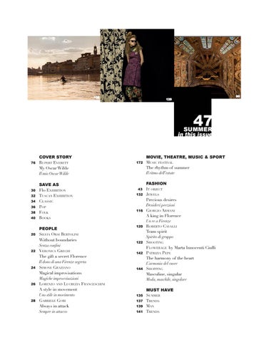 SAVE AS 30 Flo Exhibition 32 Tuscan Exhibition 34 Classic 36 Pop 38 Folk 40 Books PEOPLE 20 Silvia Orsi Bertolini Without boundaries Senza confini 22 Veronica Grechi The gift a secret Florence Il dono di una Firenze segreta 24 Simone Graziano Magical improvisations Magiche improvvisazioni 26 Lorenzo and Lucrezia Franceschini A style in movement Uno stile in movimento 28 Gabriele Gori Always in attack Sempre in attacco