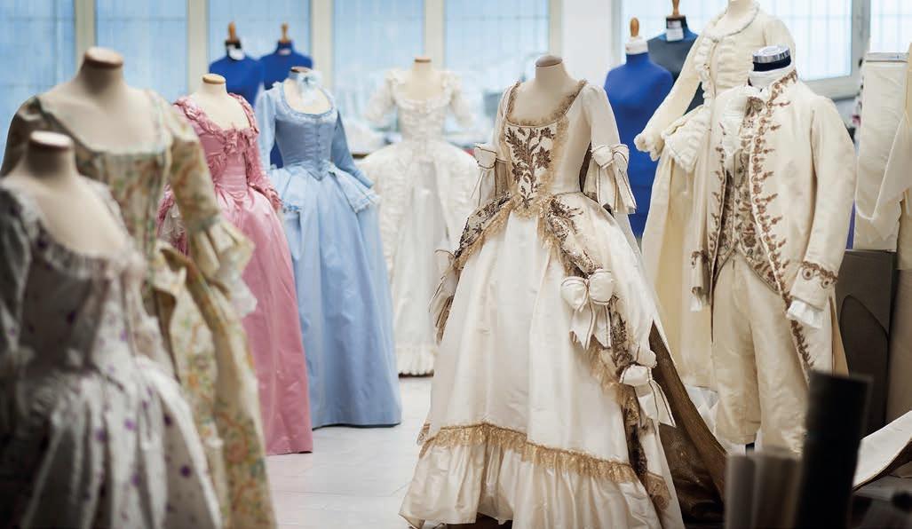 Sulla destra dell’immagine in alto: i vestiti della famosa scena dell’incoronazione (ph. Leonardo Salvini) tenza dalla corte di Vienna, a quello composto da busto e doppio panier della celebre scena della vestizione alla francese; dai costumi indossati da Maria Antonietta e Luigi XVI per l’incoronazione, a quelli legati agli incontri con il Duca di Fersen e Madame du Barry, fino a quelli della fuga da Versailles.