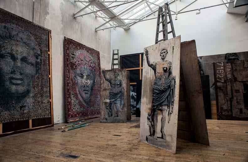 WORKS sospesa, vicina ma allo stesso custode di un fascino eterno e immutabile. Lo studio di Luca si trova in zona piazza San Luigi, un quartiere particolarmente vivace dal punto di vista culturale e artistico: “Una zona brulicante e variegata di ex fabbriche e di edifici produttivi, dai volumi ampi e luminosi, riconvertiti in abitazioni, bar e importanti centri culturali dedicati all’arte contemporanea: penso naturalmente a Fondazione Prada, ma anche alla Fondazione ICA di Milano. Il mio studio è nato dalla mia personale rielaborazione di un precedente edificio industriale e ne conserva la memoria architettonica. Amo molto questo quartiere composito e in continua evoluzione”. In questo spazio luminoso Pignatelli mette in scena un eterogeneo archivio di immagini collettive e universali, di epoche antiche e contemporanee che l’artista mette in comunicazione, sovrappone e trasforma utilizzando come supporto teloni ferroviari, legni, carte, tessuti e lamiere.