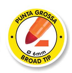 Pennarello con punta grossa e grande capacità di inchiostro Pennino super-resistente che non rientra, cappuccio ventilato e tappo di sicurezza. Inchiostri di lunga durata a base d'acqua, dermatologicamente testati, lavabili dalla pelle con acqua e sapone e dalla maggior parte dei tessuti in lavatrice a 40°C. Non lavabili da superfici porose. Non contengono glutine . Prodotto in Italia. Punta ø 5 mm