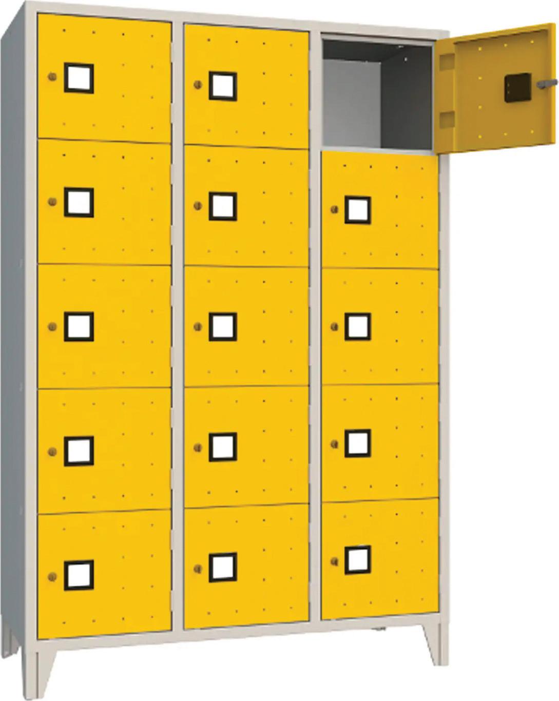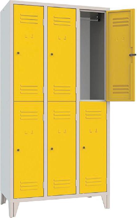 Base su piedi in acciaio h 12 cm con inserti in plastica antiossidazione, predisposti per inserimento piede con regolazione micrometrica in acciaio zincato e puntale in materiale plastico. Corpo con pannellatura unica tra tetto e schiena unito tramite microgiunzione a creare asole di aerazione e fianchi da 30 mm con bordi antitaglio piegati. Ante con cerniere apribili a 180° con canottatura di rinforzo e pieghe antitaglio, feritoie di aerazione, portacartellino stampato. Serratura a cilindro tipo Yale con doppia chiave in dotazione con chiusura Leva ad una via. Vernice a polvere epossipoliestere