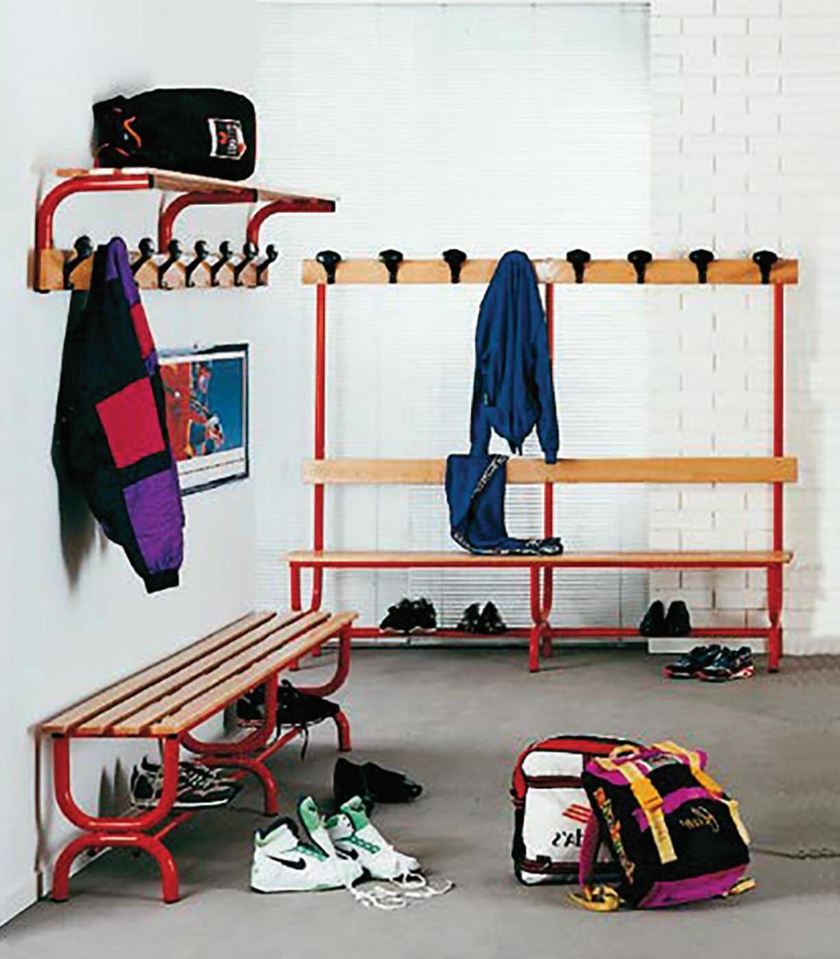 Panca spogliatoio costituita da seduta, schienale, appendiabiti, cappelliera. Seduta, schienale, appendiabiti e cappelliera in doghe di legno di pino verniciate al naturale sez. mm 100x20. Appendini in PVC. Struttura smontabile dotata di gommini antiscivolo. Dimensioni: cm 200x40x180h 991090 € 384,00