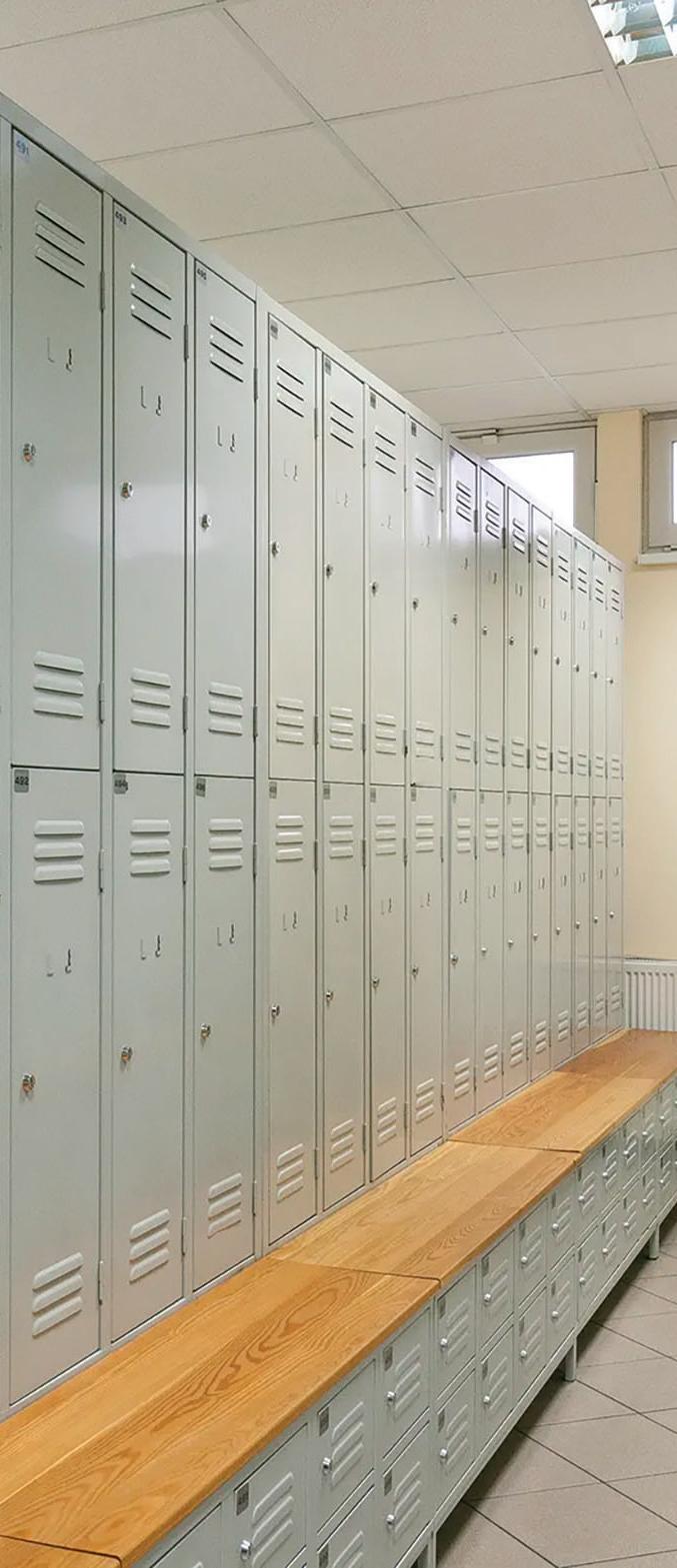 Armadietti cm 38x180 (PxH) in lamiera di acciaio 6-7/10 con mensola, ganci, ante con feritoie e serratura a cilindro.