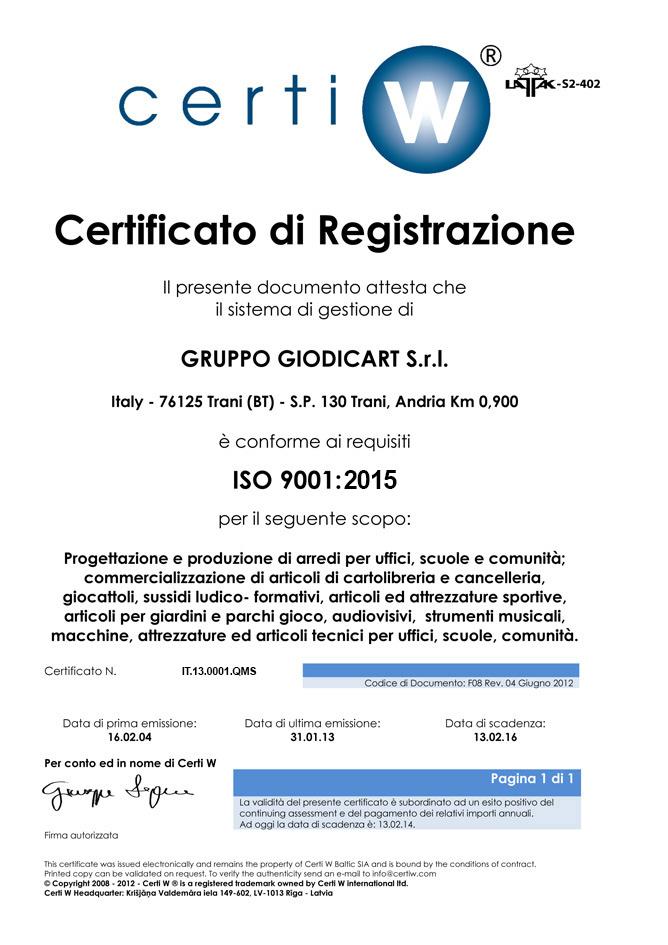 La nostra collaudata organizzazione commerciale, il costante aggiornamento tecnologico, il continuo in vestimento nella ricerca di partner di comprovata af fidabilità selezionati attraverso un rigoroso processo di controllo, ci hanno permesso di certificare la qua lità dei nostri prodotti e servizi. Infatti il nostro si stema di gestione della qualità è certificato secondo la normativa ISO 9001 2008 per quello che concerne la: progettazione e produzione di arredi per uffici, scuole e comunità e sussidi didattici, commercializzazione di articoli di cartolibreria e cancelleria, giocattoli, sussidi ludico-formativi, articoli e attrezzature sportive, articoli per giardini e parchi gioco, audiovisivi, strumenti musicali, macchine ed articoli tecnici per uffici, scuole e comunità.