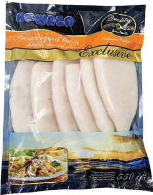 Šaldyta kalmarų filė be odos NOWACO EXLUSIVE,550 g Šaldyti kalmarų žiedai NOWACO EXCLUSIVE,300 g Šaldyti glazūruoti kalmarų žiedai tešloje 500g