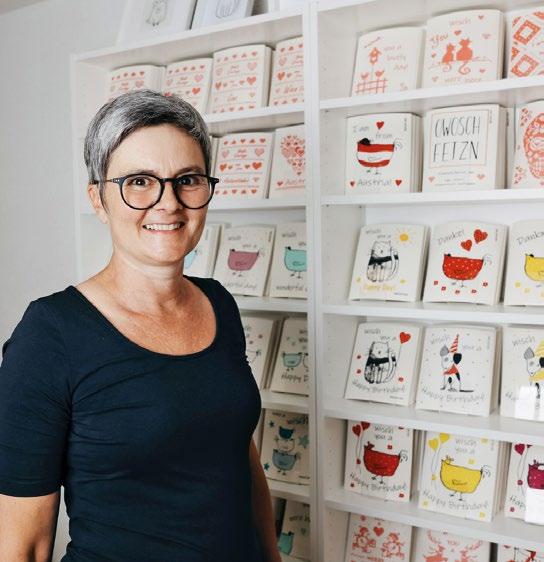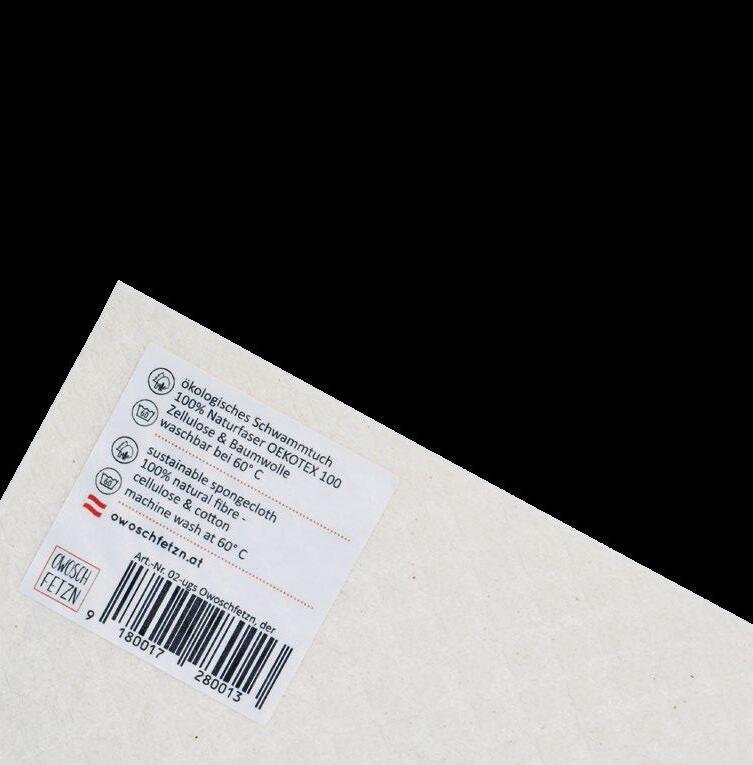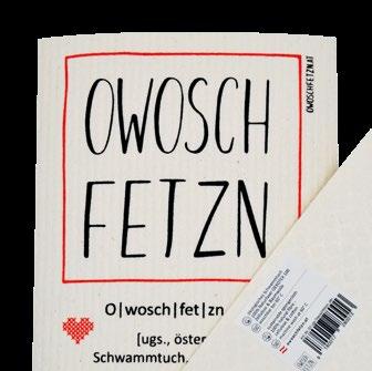 bunten Bildern und hübschen Sprüchen verarbeitet. Möglich sind beispielsweise auch Sonderdrucke für Firmen ab 250 Stück. Die Top Seller im Sortiment: das klassische Tuch mit der Aufschrift „Owoschfetzn“, gefolgt von den Motiven „Katze Frieda“ und „Henne Berta“ – übrigens beides Tiere, die es in Mayrhofers Leben tatsächlich gibt. Die 17 x 20 cm großen Tücher bestehen aus 70 % Holzzellulose und 30 % Baumwolle und werden in Deutschland zugekauft.
