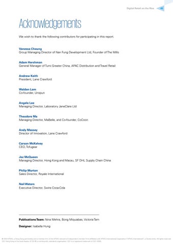 Vanessa Cheung Group Managing Director of Nan Fung Development Ltd, Founder of The Mills Adam Hershman General Manager of Tumi Greater China, APAC Distribution and Travel Retail Andrew Keith President, Lane Crawford Walden Lam Co-founder, Unspun Angela Lee Managing Director, Laboratory JaneClare Ltd Theodore Ma Managing Director, MaBelle, and Co-founder, CoCoon Andy Massey Director of Innovation, Lane Crawford Carson McKelvey CEO, Tofugear Jez McQueen Managing Director, Hong Kong and Macau, SF DHL Supply Chain China Philip Murton Sales Director, Royale International Neil Waters Executive Director, Swire Coca-Cola