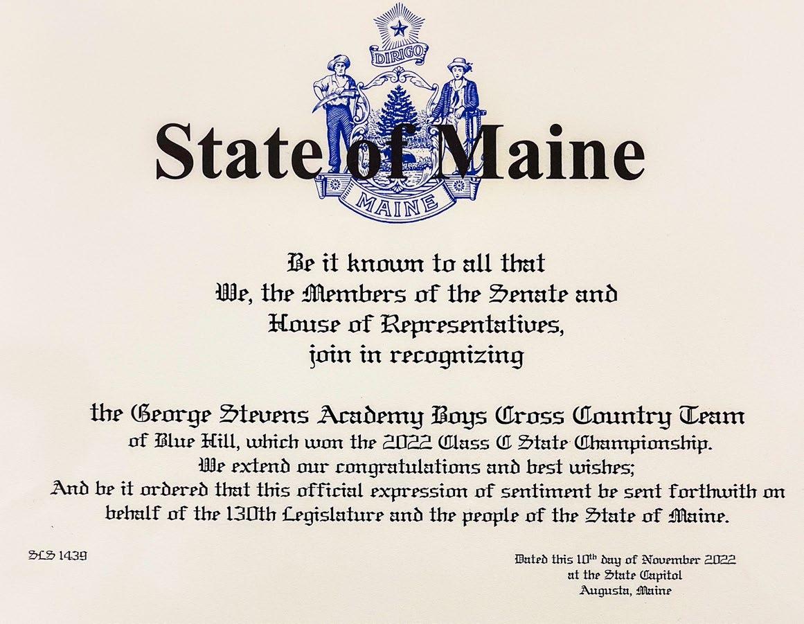 the team an official proclamation of “congratulations and best wishes” from the legislature and people of Maine in November.