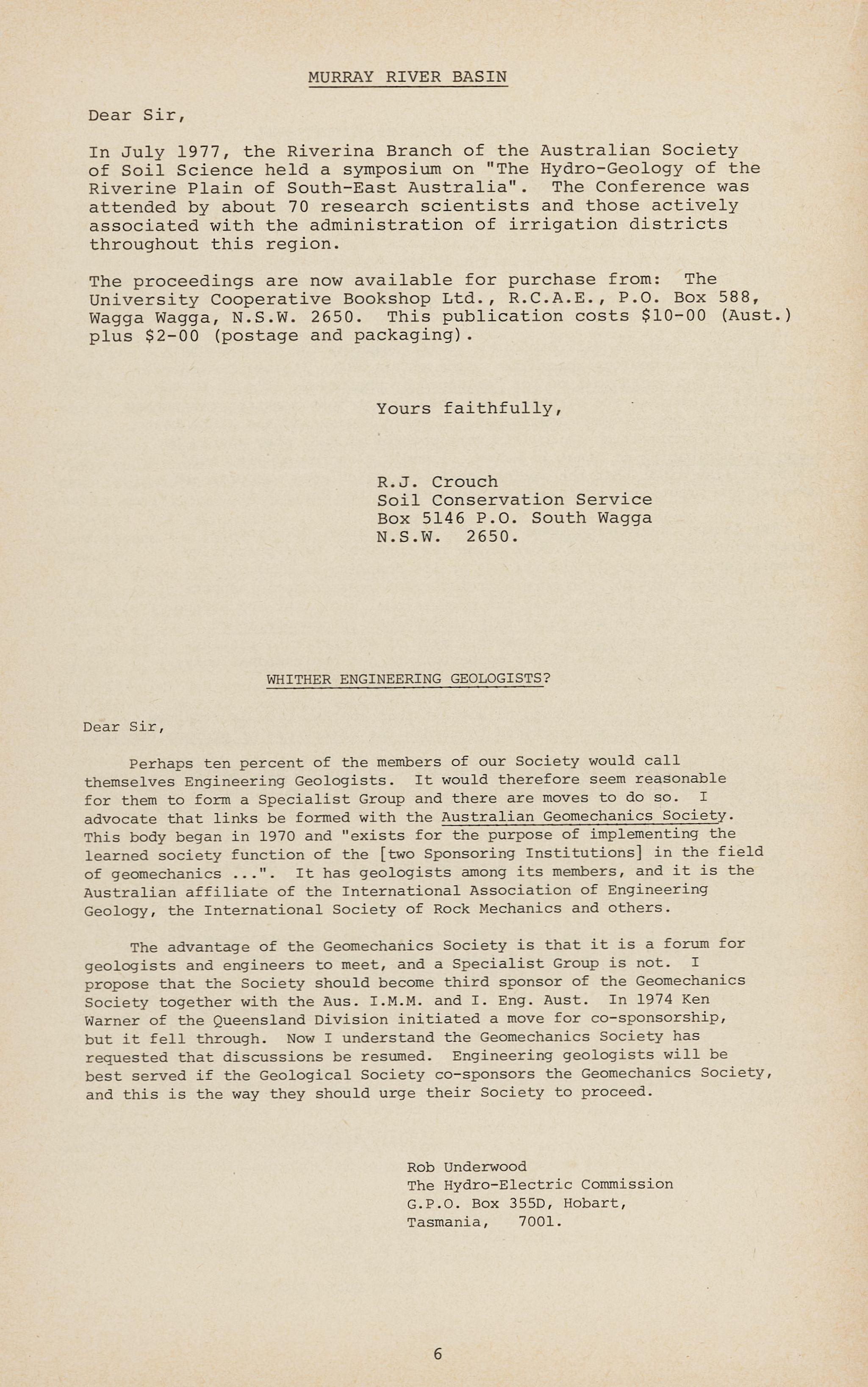 The advantage of the Geomechanics Society is that it is a forum for geologists and engineers to meet, and a Specialist Group is not. I propose that the Society should become third sponsor of the Geomechanics Society together with the Aus. I.M.M. and I. Eng. Aust. In 1974 Ken Warner of the Queensland Division initiated a move for co-sponsorship, but it fell through. Now I understand the Geomechanics Society has requested that discussions be resumed. Engineering geologists will be best served if the Geological Society co-sponsors the Geomechanics Society, and this is the way they should urge their Society to proceed.
