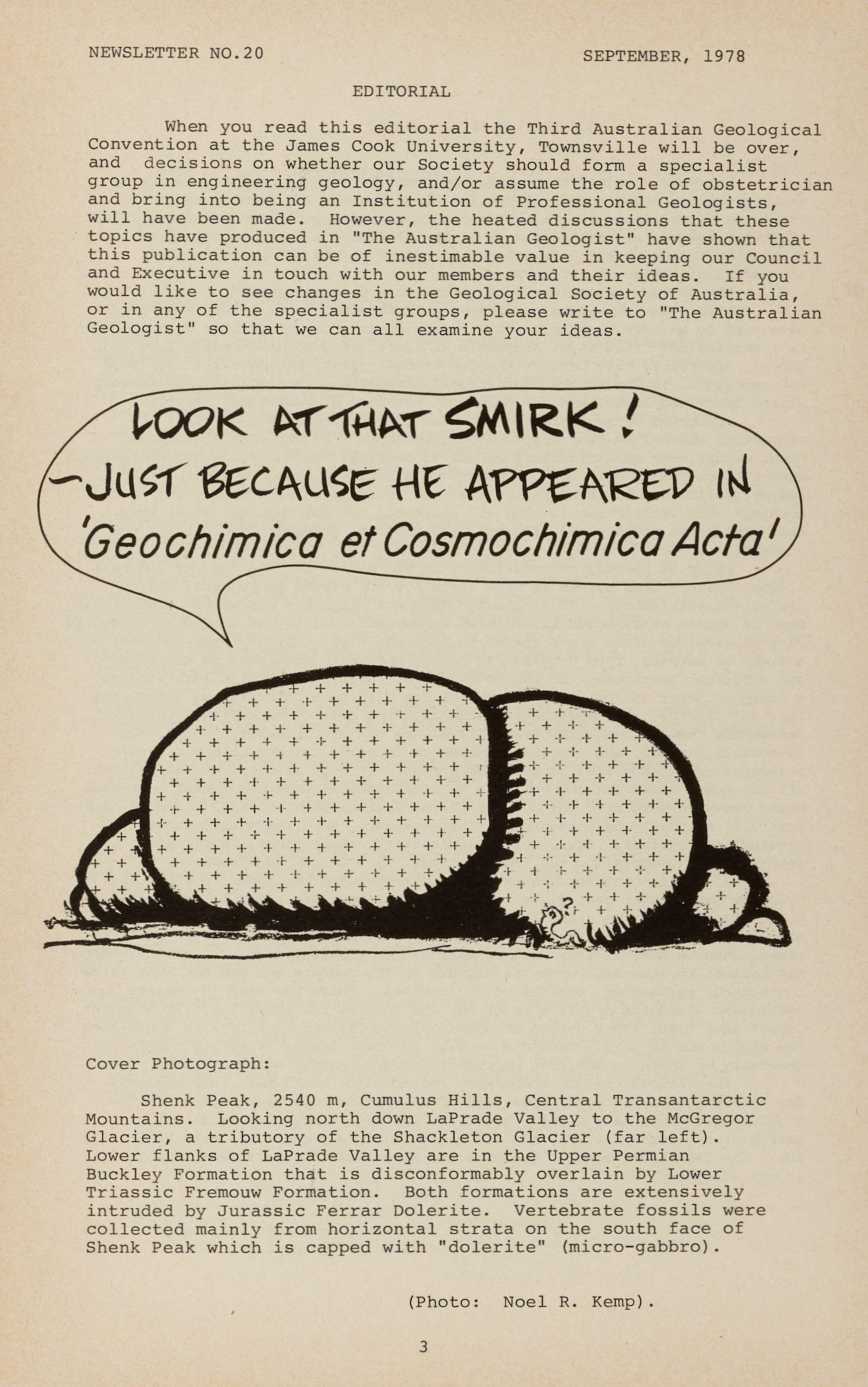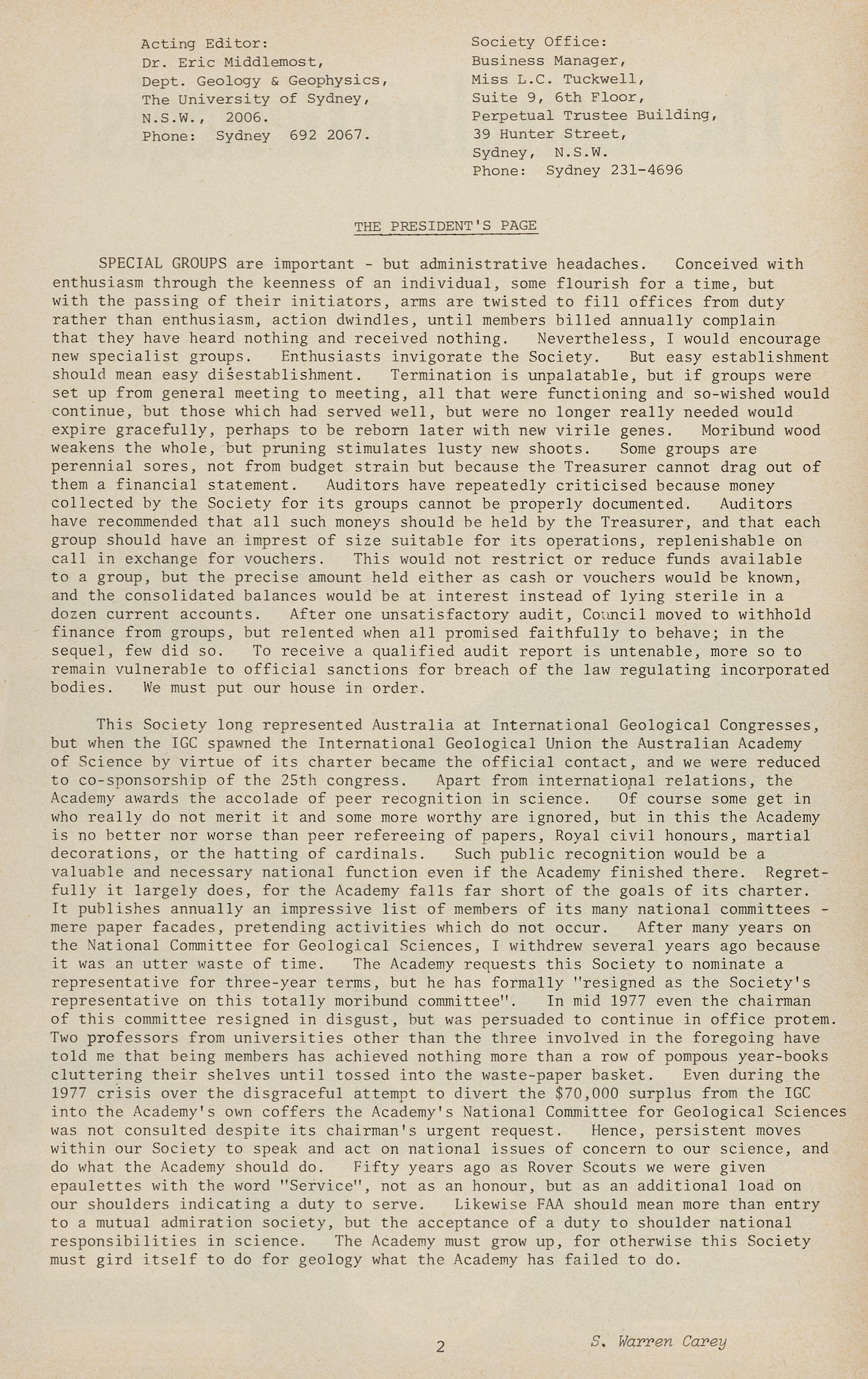 When you read this editorial the Third Au stralian Geological Convention at the James Cook University, Townsville will be over, and decisions on whether ou r Society should form a specialist group in engineering geology, and/or assume the role of obstetrician and bring into being an Institution of Professional Geologists, will have been made. However, the heated discussions that the se topics have produced in "The Australian Geologist" have shown that this publication can be of inestimable value in keeping our Council and Executive in touch with our members and their ideas. If yo u would like to see changes in the Geological Society of Australia, or in any of the spec ialist group s, plea se write to "The Australian Geol ogist" so that we can all examine y our ideas.